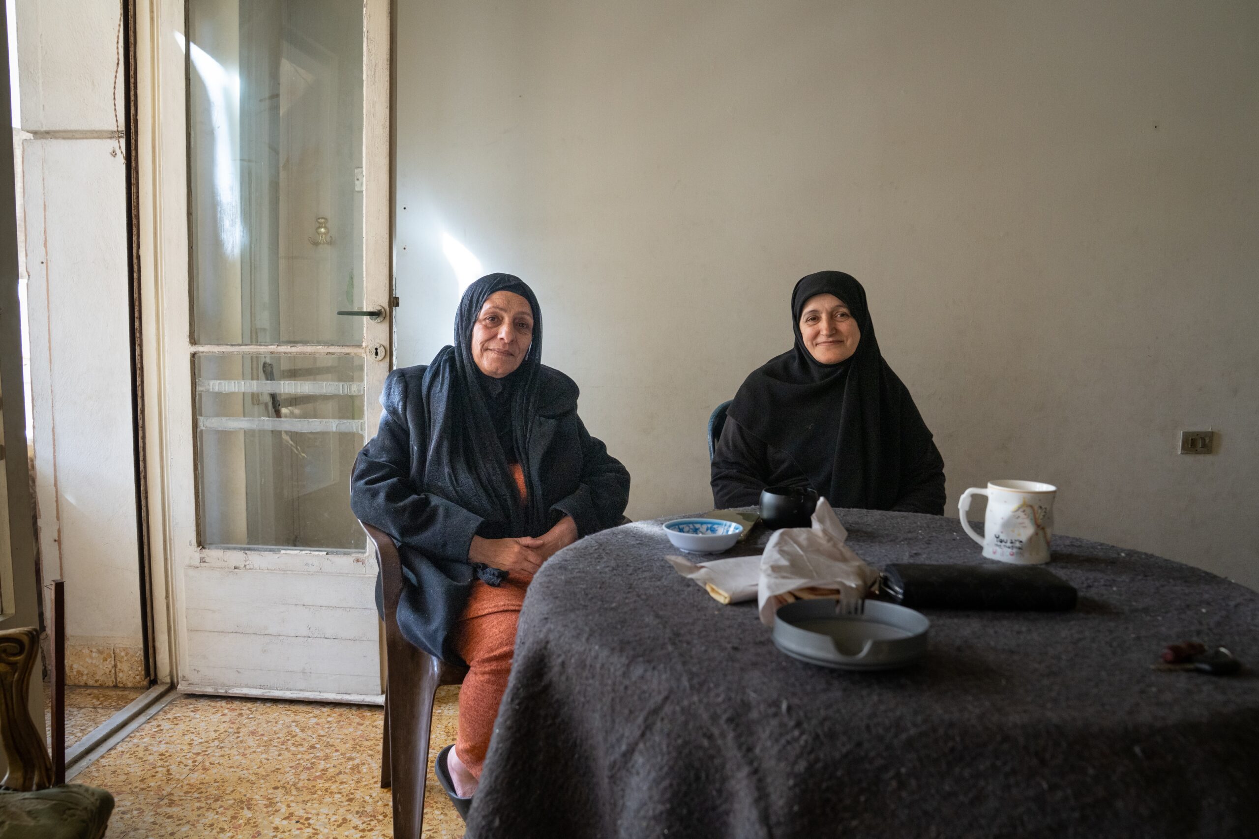 They grew up amid olive groves in southern Lebanon. The son of one married the other's daughter. Now they're living temporarily in a vacant building in central Beirut, displaced many times. (Image credit: Claire Harbage)